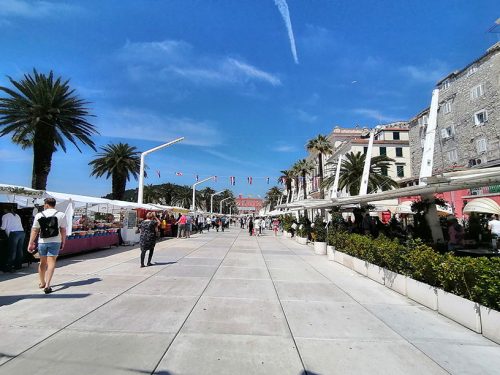 To go to Split were several buses you can take, the bus stop is only 5 minutes from the camping, so we went by bus to Split. The bus leaves you next to the Promenade which is full of typical product stands, terraces, bars and restaurants, one of the most animated areas of the city. From there we went to the Independent Square built in the 19th century and surrounded by Renaissance buildings with rosy facades and arched galleries on three sides.