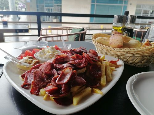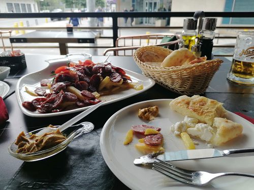 We decided to have an early dinner in the new city. On the main street, we saw a place called Zeppelin Cafe with a cheap and good menu. We shared a platter of 4 typical sausages of the country with butter chips, tomatoes, a bowl of typical cheese and typical bread which is like pitta bread. The food was delicious, and the tomatoes were sweet. A huge plate of food for only 9 euros! I had a cocktail super yummy and Ben 2 beers and we paid for all 15 euros.