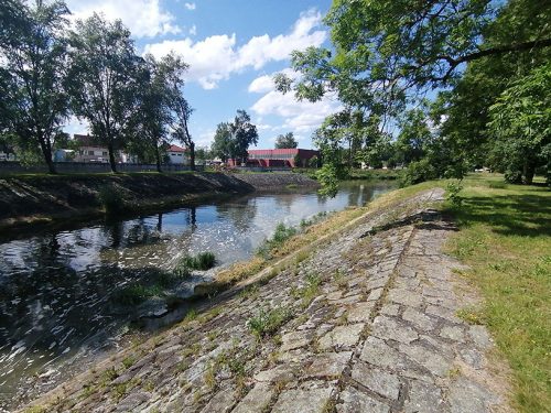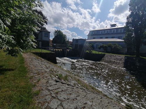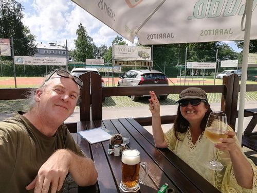 We stayed at what they call the town campsite, which is a grassy area outside the bar (49.18817, 14.701185 lat, long). The place is very nice, on the river bank and outside a beer garden which gets lively in the afternoons, since the townspeople come to fish, have picnics and use kayaks, and a 3-minute walk from the town centre. They charged us 18 euros, 2 euros for the dog! Which seems very expensive to us, since the facilities are quite rustic. The bathroom is fine with paper and the door can be closed, but in the showers, the door cannot be closed and they are all in a row without curtains, so anyone who enters sees you naked taking a shower! We didn’t find anywhere to empty the water, the chemical toilet could be emptied in the bathrooms, and to fill water the man at the beach bar opened an area where you could put your hose. In short, the place is expensive, what is very good is the bar and the pension restaurant with good and very cheap typical food! As an anecdote, on our second day there, the police came to tell us that we had to move further into the grass area because the circus was set up where we were parked! The circus follows us from country to country!
