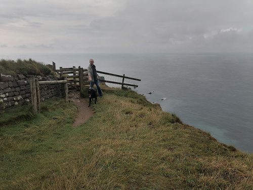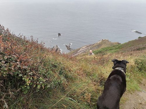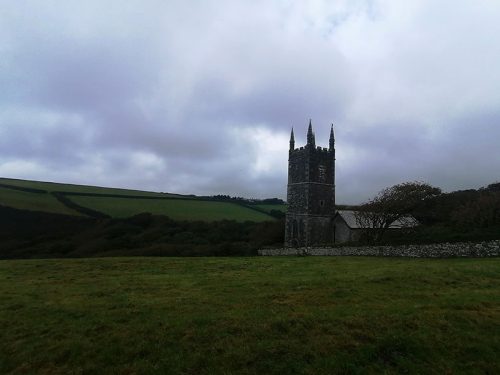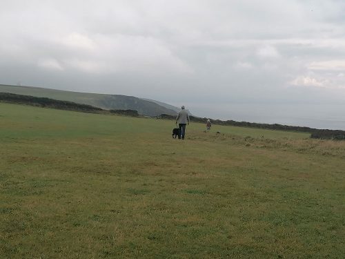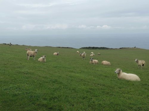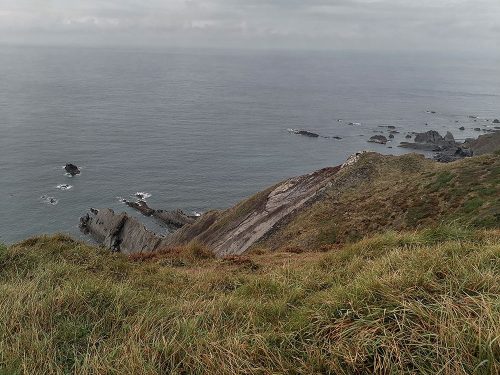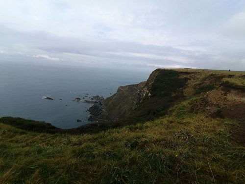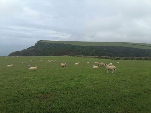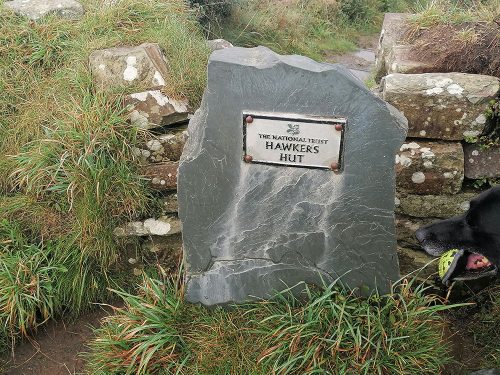 We continue uphill pastures filled with sheep until we reach the top of the cliffs, where we come across Hawker’s Hut, a historic hut originally built by the eccentric clergyman, poet and antiquarian Robert Stephen Hawker, located approximately 1 mile from Morwenstow Church.