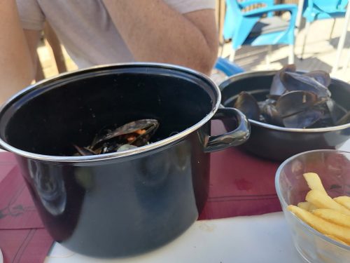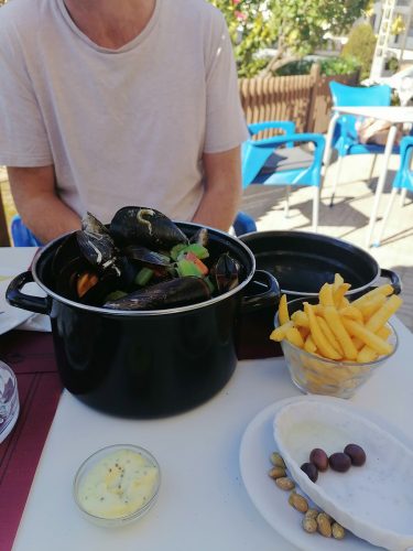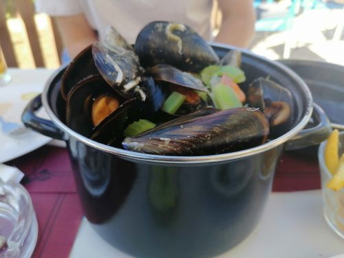 Ayer miércoles nos fuimos a comer mejillones, es típico de aquí, un bol de 1 kilo de mejillones con patatas fritas por 11 euros. Ya lo intentamos el sábado pasado cuando fuimos andando al faro y se habían agotado. Así que ayer llegamos a la 1.15pm, tempranito por si acaso, pero se habían agotado otra vez! Nos dijeron que la gente llamaba y reservaba 1 o 2 kilos de mejillones para la hora que fuese, por lo que nos quedamos otra vez sin mejillones. Así que le dijimos a la camarera que nos reservase 1 kilo para hoy a las 2 de la tarde. Y hoy finalmente comimos mejillones, a Ben le gustaron tanto que después de un kilo pidió otro kilo mas. Ben dice que son los mejores mejillones que ha probado, la salsa era con apio, ajo, cebolla y vino tinto.