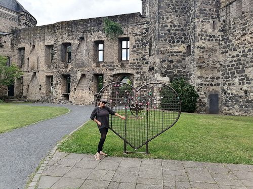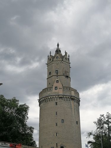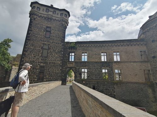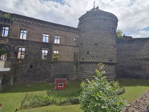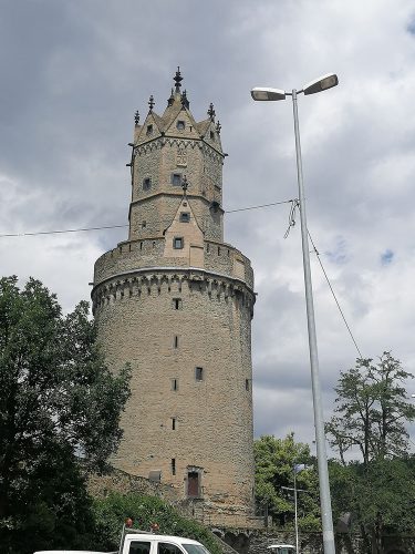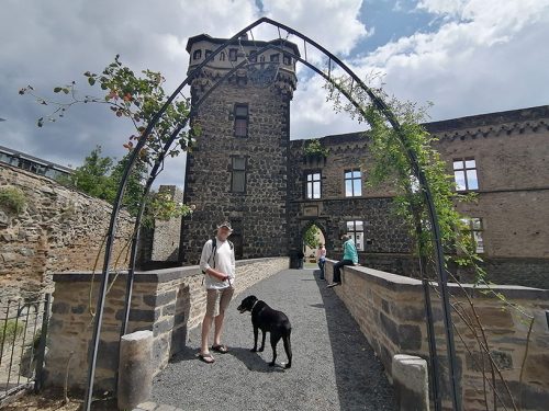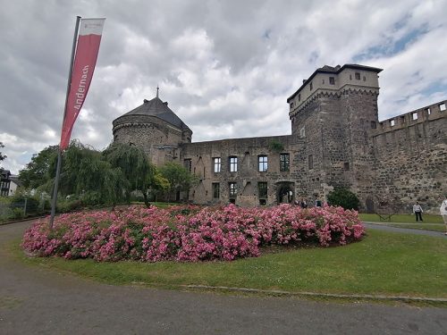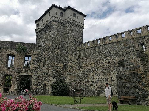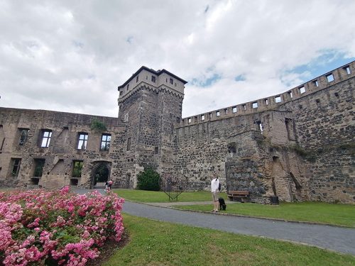 Terminamos nuestro recorrido en las ruinas del castillo y su jardín, la construcción del castillo comenzó alrededor del año 1200. En 1689 fue destruido por las tropas francesas. Las balas de cañón originales, apiladas en forma de pirámide frente al muro, provienen de la Guerra de los Treinta Años. En 2013 gallinas fueron introducidas en el foso del castillo y sus huevos se pueden comprar en una tienda de la ciudad. La puerta del castillo servía como entrada representativa a la ciudad. Sin embargo, también fue destruida en 1689.